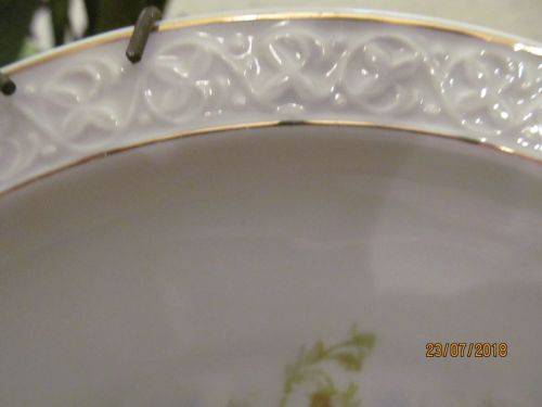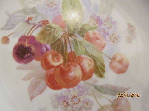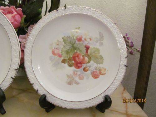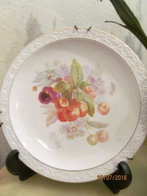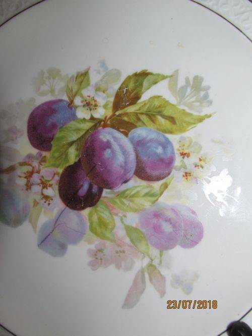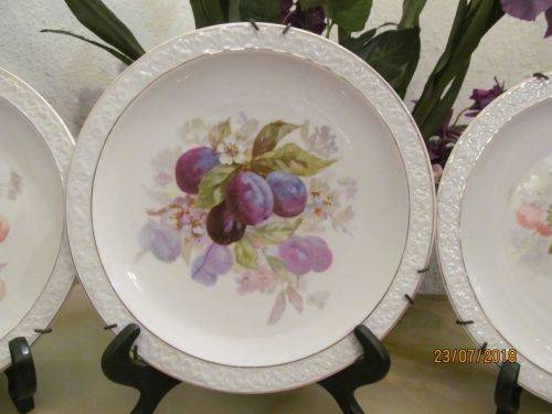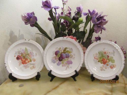 THREE FINE PORCELAIN DECORATIVE VINTAGE PLATES EACH WITH A RAISED FLORAL AND SCROLL PATTERN VERGE HIGHLIGHTED BY GOLD TRIM ALONG THE RIM AND DECORATED WITH A VIVID AND DETAILED FRUIT PORTRAYAL IN THE CENTER. PEACHES, CHERRIES AND PLUMS ALL ENTICING WITH A GREEN LEAFY BACKGROUND ALL PORTRAYED AS FADING INTO A MISTY CONTINUATION OF THE PATTERN AS IT FADES IN THE DISTANCE