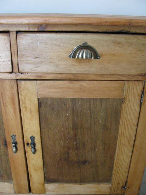 This cupboard most probably could tell a story or two including a mouse hole saga. Six layers of paint had to be removed to expose the beautiful solid oregon pine. There are a few very small ingrainedÃÂÃÂÃÂÃÂ whiteÃÂÃÂÃÂÃÂ specs of paintÃÂÃÂÃÂÃÂ visible which were difficult to remove without butchering the wood. It was in a farming environment and also used as a 'workbench'. Hence it has a fair amount of marks and holes. Overall, however, it is in very good condition. The handles are not original but similar to originals.ÃÂÃÂÃÂÃÂ Size 86cm high, 1.06m wide, 44cm deep.