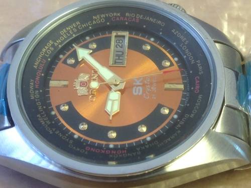 Condition Brand New Old StockModel No. 'SK' 21 Jewels Worldtimer My ref: No.48Case Brushed Stainless Steel. Polished crowns & pusher.Dial Colour Rare in METALLIC ORANGE with Black 'Cheeks' (as shown) With World Cities in Gold on a Black Internal GMT scaleBezel Fixed. Polished Metal Dial Type Metallic Orange with Dots & Batons on Black. Orient logo at 12 0'clockMovement Orients own 469BA21-8A CA Calibre Automatic (Self Winding)Case Diameter 40mm (Without crowns)Thickness 12mm Case Back Top quality screw down typeHands Luminous Solid Cream hands w. Gold / Red Pointed Second Sweep handCrystal MineralCrowns Polished Stainless Steel knurled domed crowns & plain pusher. Band type Brushed & Polished Stainless Steel BraceletClasp Matching brushed S/Steel fold over safety type with raised logoBand Size 20mm Band Length Men’s. Fits up to 215mm