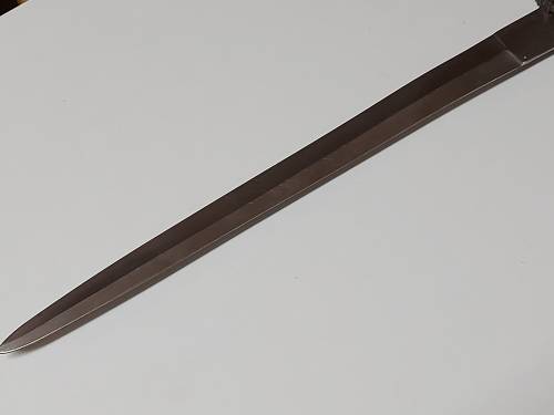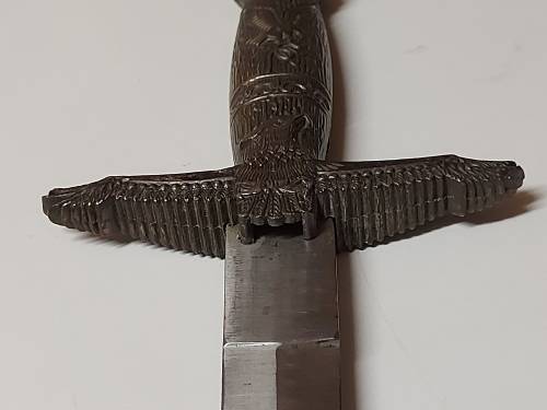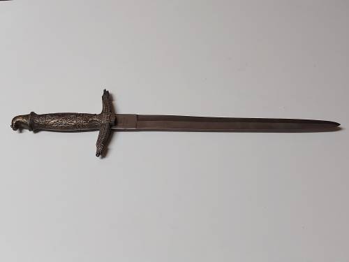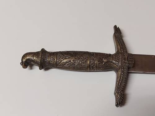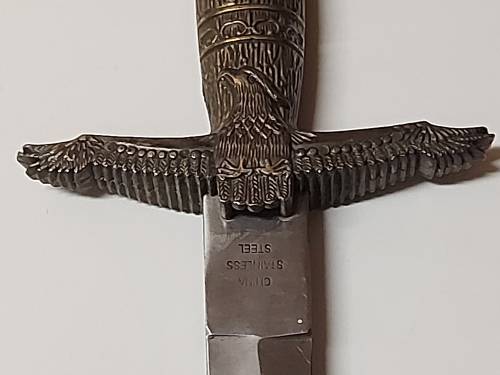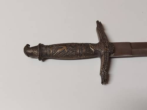 ORIENTAL DAGGER WITH A BRASS/BRONZE EAGLE MOTIF HILT AND A SOLID CHINA STAINLESS STEEL BLADE. IT MEASURES 44 CM LONG, WITH THE HILT BEING 14 CM AND THE CROSS GUARD 11 CM AND IS IN A GOOD PRE-OWNED CONDITION WITH NO RUST