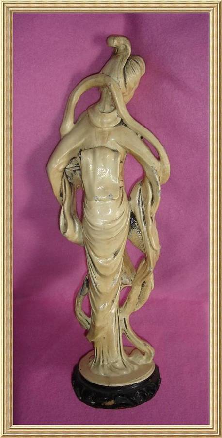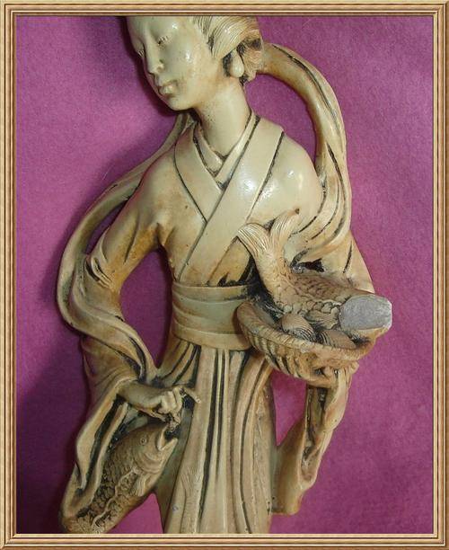 A lovely vintage hand carved resin compsite sculpture of a Geisha Fishmonger, She is attired in traditional kimino with two fish roped in her right hand with a wicker flat basket cradled in her left hand, Within the basket are two oysters in shell and a fish. She has some age chips and flakes. Her height is 47cm and her weight 1883gsm.