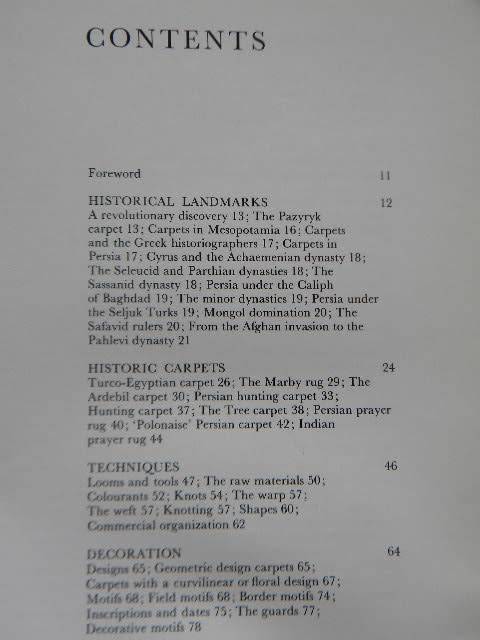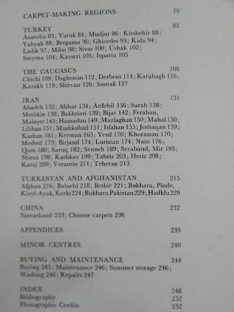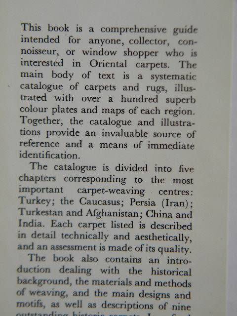 Hardcover with d/j. Binding is tight. Published 1974 (second impression) with 252 pages. Beautiful photographs illustrated the text. Watermark throughout at bottom of pages and inside of d/j. Gift inscription on first end page. A good guide for collectors. The book is divided into five chapters corresponding to the most important carpet-weaving centres: Turkey, the Caucasus, Persia (Iran), Turkestan and Afghanistan, China and India. A lovely book teaching more about the historical background, materials and weaving, designs and motifs. Add R60 for shipping via Paxi (Pep Stores to Pep Stores) or R120 for faster shipping via The Courier Guy. Buy more than one book to save on shipping costs.No shipping overseas.