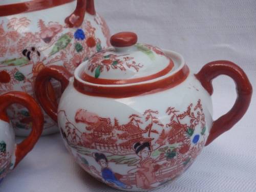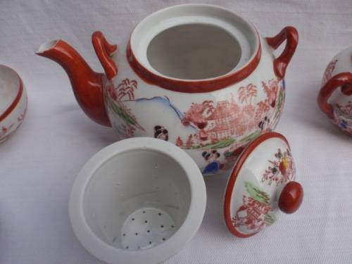 VINTAGE: ORIENTAL TEA SET: TEAPOT, SUGAR BOWL, MILK JUG AND FOUR CUPS AND SAUCERS. THEY HAVE BEEN SEMI HAND PAINTED - STENCILS AND THEN HAND PAINTED. THE CUPS AND SAUCERS ARE VERY DELICATE, ALMOST SHELL LIKE. ON VERY CLOSE INSPECTION, THE TEAPOT AND THE MILK JUG EACH HAVE A MINUTE CHIP, ABOUT 2mm IN SIZE ON THEIR SPOUT AREAS (NOT NOTICEABLE AT ALL) SIZE: TEAPOT HEIGHT 13CM. SUGAR BOWL, HEIGHT 9CM. MILK JUG HEIGHT 7CM. TEACUPS DIAMETER AT LIP 9CM. SAUCERS DIAMETER 13.5CM. TEAPOT HAS INNER, REMOVEABLE CERAMIC TEA LEAVES STRAINER.