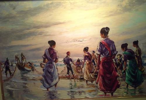 A STUNNING - LARGE FISHING SCENE BY THE RENOWNED ARTIST ZAGNI ZEELIE. IT IS BEAUTIFULLY TEXTURED AND HIS PALETTE KNIFE WORK IS AMAZING.