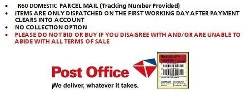 R35.00 Standard shipping using one of our trusted couriers applies to most areas in South Africa. Some areas may attract a R30.00 surcharge. This will be calculated at checkout if applicable.