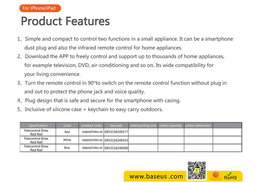 Package includes:1x Baseus Telecontrol Elves Red Nail Series Smartphone Remote Control.