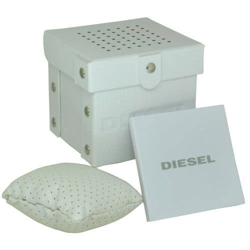 Black stainless steel case with a black leather strap. Fixed stainless steel bezel. Black dial with rose gold-tone hands and index hour markers. Dual time display at the 9 o'clock position. Dial Type: Analog. Luminescent hands. Date display at the 3 o'clock position. Chronograph - three sub-dials displaying: 60 second, 60 minute and 24 hour. Scratch resistant mineral crystal. Pull / push crown. Solid case back. Case diMen'sions: 61 mm x 51 mm. Case thickness: 13 mm. Round case shape. Tang clasp. Water resistant at 30 meters / 100 feet. Functions: chronograph, date, second time zone, hour, minute, second. Casual watch style. Diesel Little Daddy Dual Time Chronograph Black Dial Leather Men's Watch DZ7291.