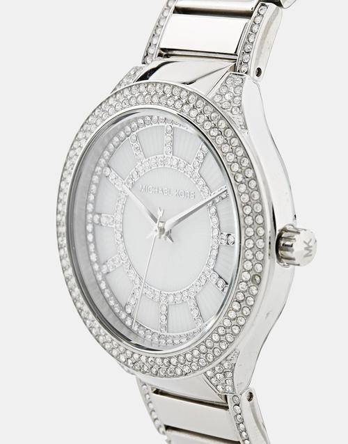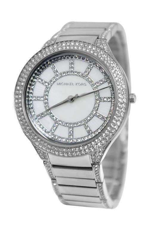 Stainless steel case with a stainless steel bracelet. Fixed silver-tone bezel set with crystals. Mother of pearl crystal-set dial with silver-tone hands and crystal-set index hour markers. Dial Type: Analog. Quartz movement. Scratch resistant mineral crystal. Pull / push crown. Solid case back. Case diameter: 38 mm. Round case shape. Deployment clasp with push button release. Water resistant at 50 meters / 165 feet. Functions: hour, minute, second. Casual watch style. Michael Kors Kerry Mother of Pearl Stainless Steel Ladies Watch MK3311.