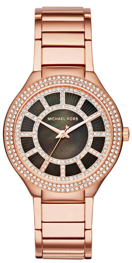 Stainless steel case with a stainless steel bracelet. Fixed ROSE GOLD-tone bezel set with crystals-set dial with silver-tone hands and crystal-set index hour markers. Dial Type: Analog. Quartz movement. Scratch resistant mineral crystal. Pull / push crown. Solid case back. Case diameter: 38 mm. Round case shape. Deployment clasp with push button release. Water resistant at 50 meters / 165 feet. Functions: hour, minute, second. Casual watch style. Michael Kors Kerry Mother of Pearl Stainless Steel Ladies Watch MK3397