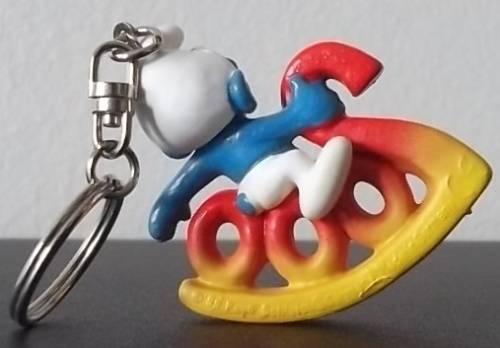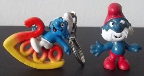 This Is a Baby Smurf, Riding The Year 2000 !! This Baby Promo was made with a Key chain attachment to his head. The Millenium Baby Promo was ONLY made with a Key Chain attachment. This was the only way this Baby Promo special was released by the SCHLEICH Company who make Smurfs , and was never made without the Key Chain. Made of the same PVC Rubber material as all Smurfs..
