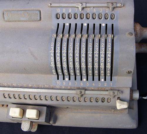 Odhner in Russia and Baldwin in the US patented their machines based on a similar mechanical principle: pinwheel machine (see Martin, page 12). Many machines that you will see on this web site are so-called Odhner type machines. In 1907, to differ own production from other Odhner type machines, the name was changed to Original Odhner.