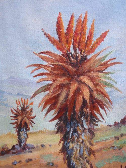 WONDERFUL ORIGINAL OIL by J.HESP - SOUTH AFRICAN LANDSCAPE WITH ALOES. WELL FRAMED AND IN GOOD CONDITION. SIZE: 33CM X 28CM (TOTAL SIZE INCLUDING FRAMING) SIZE OF ART: 24CM X 19CM.