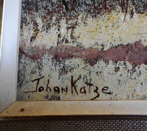 This painting of a tranquil bush veld scene is typical of Johan Kotze's work.The painting has a quality of restfulness about it. if you look closely you will see the small aloes blooming among the dry autumn grass. Painting is well framed. Size 270mm by 400mm framed, 170mm by 300 mm without the frame.