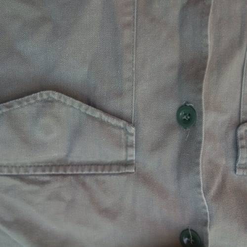 This shirt is cut/sewn in the std SADF style with the charachteristic SADF shape buttons here in dark olive green. All buttons are present.