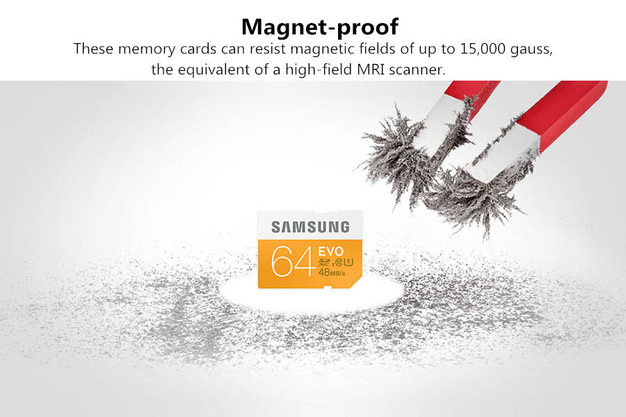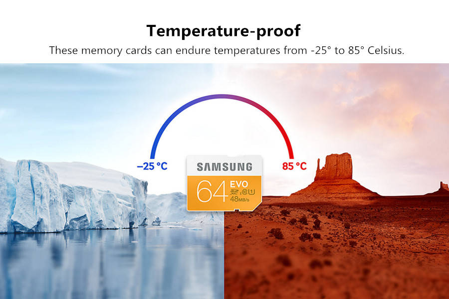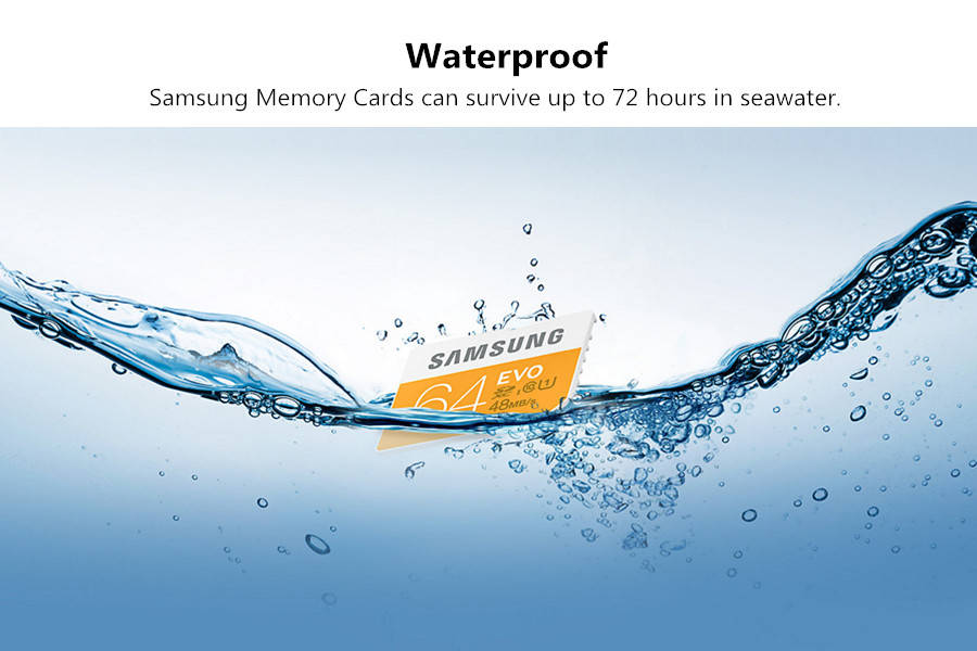 1. Brand: Samsung 2. Model: MB-SP16D / MB-SP32D / MB-SP64D 3. Item: SD Memory Card 4. Family line: EVO 5. Capacity: 16GB / 32GB / 64GB 6. Interface: UHS-I, compatible to HS interface 7. Speed Class: Grade 1, Class 10 8. Speed(Max): 48MB/s (Actual speed may vary depending on use host device conditions and environment; Write speed is slower than transfer speed) 9. Dimension: 32 X 24 X2.1mm 10. Compatibility: Digital Camera, DSLR, Camcorder, Laptop, etc 11. Operating Voltage2.7 ~ 3.6 V 12. Storage Temperature-40 °C to 85 °C 13. Operating Temperature-25 °C to 85 °C 14. Durability10,000 mating cycles