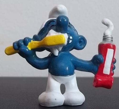 He is in excellent condition !! He is the Medium Dark Blue Skin, Long & Thick White Stripe On Tube, Darker Yellow Brush, Lighter Red Tube, Long toothpaste VARIANT. Excellent Condition !!......see photos !!! All spots of white in the photo that have not been described are just spots of glare from the camera. A great addition to any Smurf collection !!!