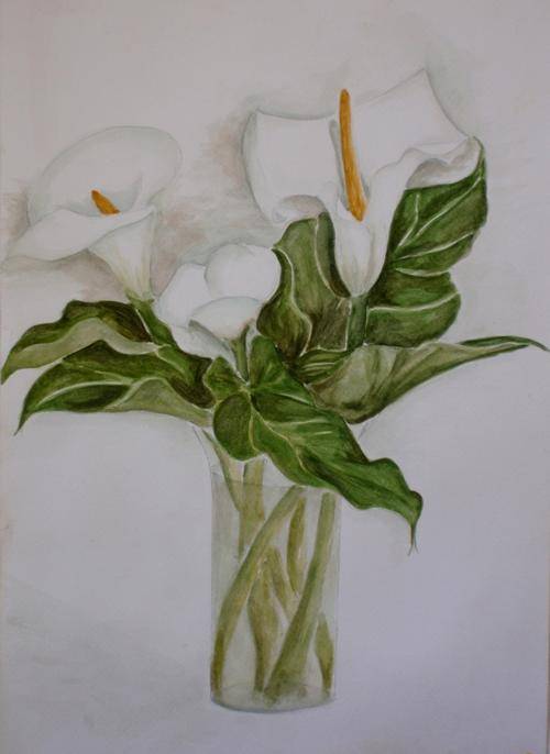 BEAUTIFUL ORIGINAL WATERCOLOUR PAINTING 'ARUMS IN GLASS VASE' SIZE: 42CM X 30CM - ON GOOD QUALITY WATERCOLOUR PAPER - REQUIRES FRAMING. NOT SIGNED.