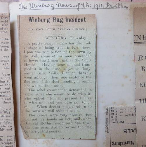 ORIGINAL WW1 UNION JACK CAME WITH INTERESTING DIARY FROM A FAMILY IN THE WINBURG DISTRICT-THE DIARY CONTAINS AN INTERESTING COLLECTION OF LETTERS,PAPER ARTICLES & PHOTOS & NAMES OF SOLDIERS( & REBELS) INVOLVED IN THE WAR AROUND WINBURG-WITH THIS A BOOK WITH A LOT OF SIGNATURES AS WELL AS AN ALBUM WITH PHOTOS TAKEN WITH A BROWNIE CAMERA-THIS SPECIFIC FLAG HAVE AN INTERESTING HISTORY (PAPER CLIPPING CONFIRMS IT)AS AT THE OCCUPATION BY DE WET SOME OF THE MEN PROCEEDED TO LOWER THE UNION JACK AT THE COURT HOUSE-HAVING DONE SO & TRAMPLED IT IN THE DUST A YOUNG LADY NAMED MRS. WILLIE PIENAAR,BRAVELEY WENT AMONGST THEM AND SNATCHED THE FLAG OUT OF THE DUST BINDING IT AROUND HER WAIST LIKE A SASH-HAND STITCHED THE FLAG MEASURES 270X140CM