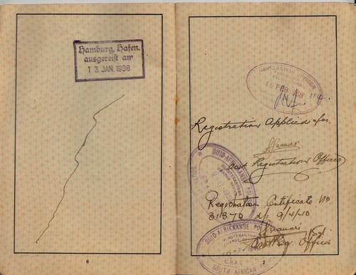 VERY INTERESTING REIS PASS. THIS NON, HAS TRAVELED THREE TIMES TO SOUTH AFRICA FROM 1938 TO 1940. SA IMERGRATION STAMPS EVIDENT IN THE BOOK. THERE IS SPECULATION THAT THIS WAS A GERMAN MALE DISGUISED AS A NON. THIS WILL BE A NICE PIECE TO DO SOME RESEARCH ON. THIS MIGHT HAVE BEEN A GERMAN OFFICER COMING TO SEE THE LEADERSHIP OF THE SA NAZI PARTY. WHO KNOWS.
