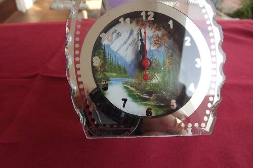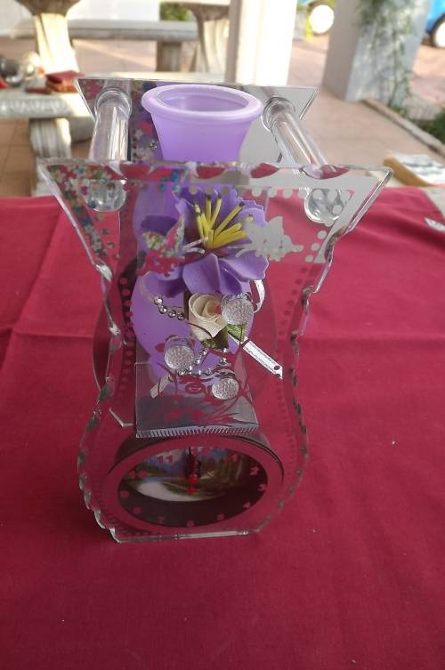 Ornament with purple flower vase on clock.Mirror at back.Perspex on front.20cm high.New condition