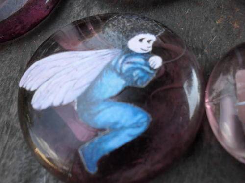 one 4cm diameter. The item is coloured glass & the fairies & goblins