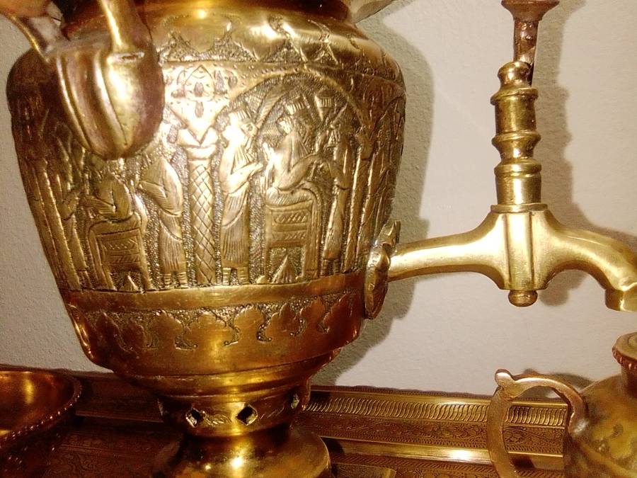 Of typical form in the King imperial style, a classic samovar set tooled in brass comprising a miniature brass samovar, Kettle drip bowl and Peacock tray. The samovar cylindrical with flared handles on a pedestal base, two bowls and a Vase.