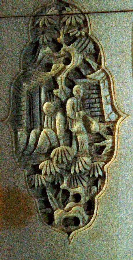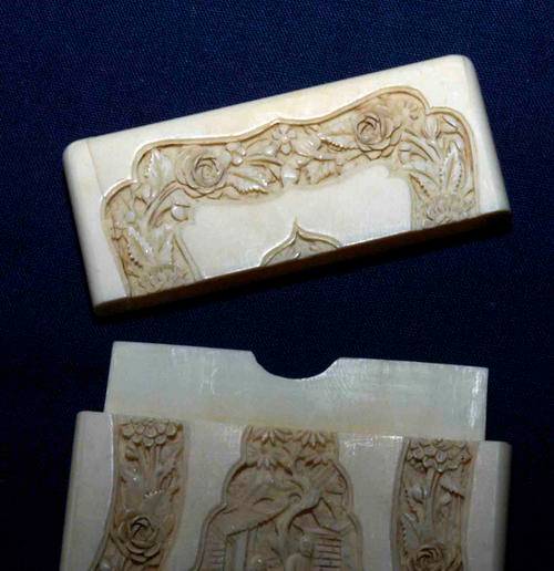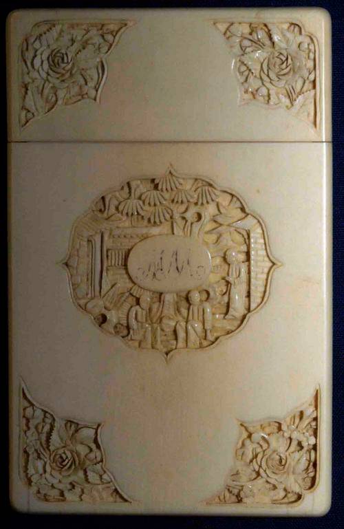 This carved ivory card case (107x67mm) has stunning detail in its ornate carvings. There is no damage to the carvings, but the lid has a small crack on the top left corner (see pictures) -- and there is a small stain on one side. The initials "MM" are carved into the panel on the back.