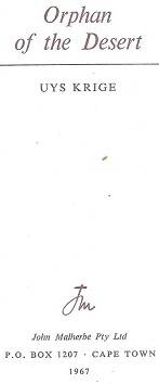 First Edition, Hard Cover, Published By John Malherbe 1967