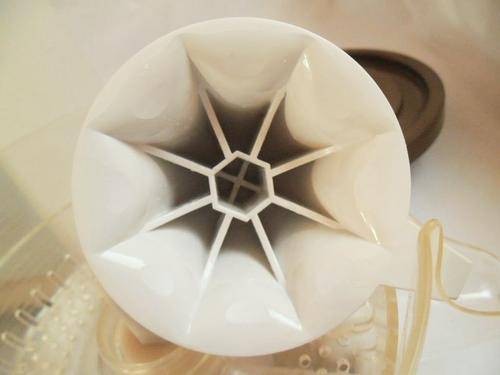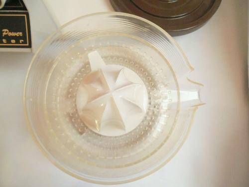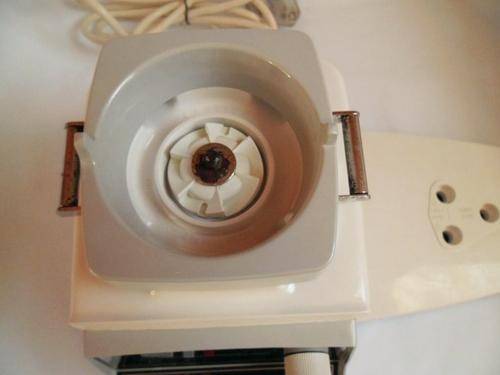 Every single piece is in beautiful 100 % clean working condition. The whole set has only three small blemishes: the two white buttons are slightly worn, the bowl has a small chip and there is a little bit of rust on the centre piece of the machine.