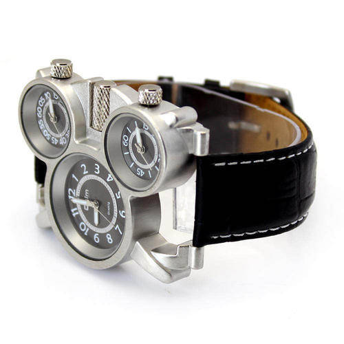 The distinctive three multi time zone dials features the characteristic classic round dial which has contributed to the enormous popularity of Oulm military and sport wathes. The central dial is highlighted surrounding by two small dials.