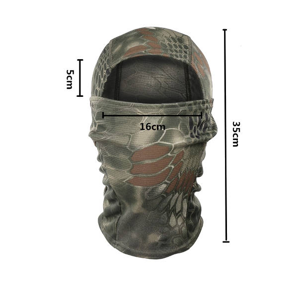 Specification: Material: Polyester Color: Black, Wasteland, Mountain Land, Desert, Woodland Pattern: Camouflage Head Circumference: About 54-58cm(Elastic) Eyes Width: About 16cm(Elastic) Eyes Heigth: About 5cm(Elastic) Hat Total Length: About 35cm(1cm=0.39Inches)