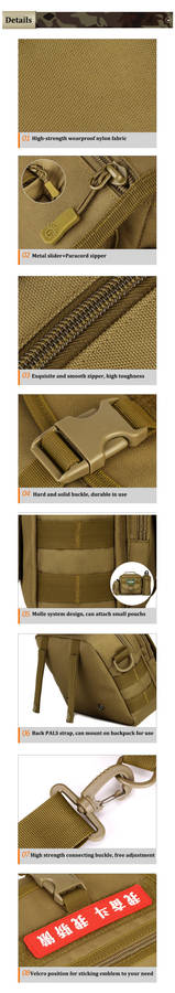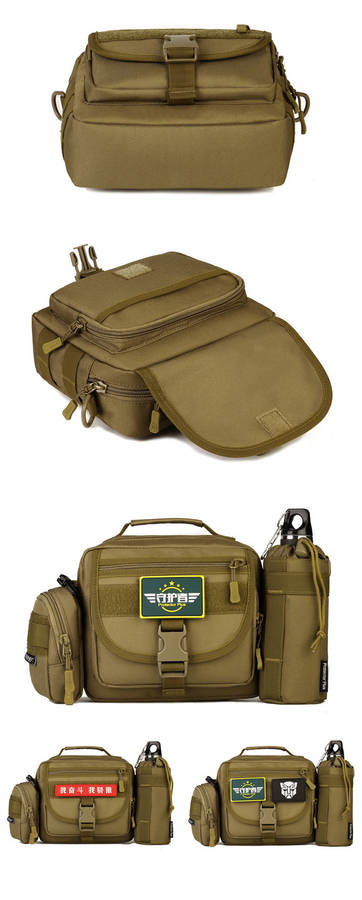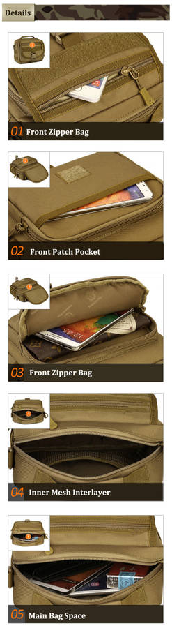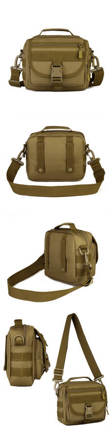 Features: High strength nylon fabric, wearproof and anti-tear. Reinforced stitching and strap, paracord zipper, firm and durable. Strong water resistance, well protecting items in the bag. Front velcro design, can attach tactical emblem to it. Strong buckle, molle system design, can attach to other molle gears. Great uility, can used as a messenger bag, handbag, big accessory bag etc.