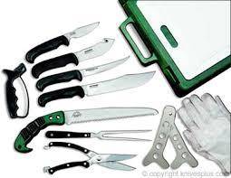 This set includes a caping knife, gut-hook skinner, boning/fillet knife, butcher knife, wood/bone saw, carving fork, full-size cutting board, ribcage spreader, game cleaning gloves, and a tungsten carbide sharpener to maintain a shaving-sharp cutting edge at all times.