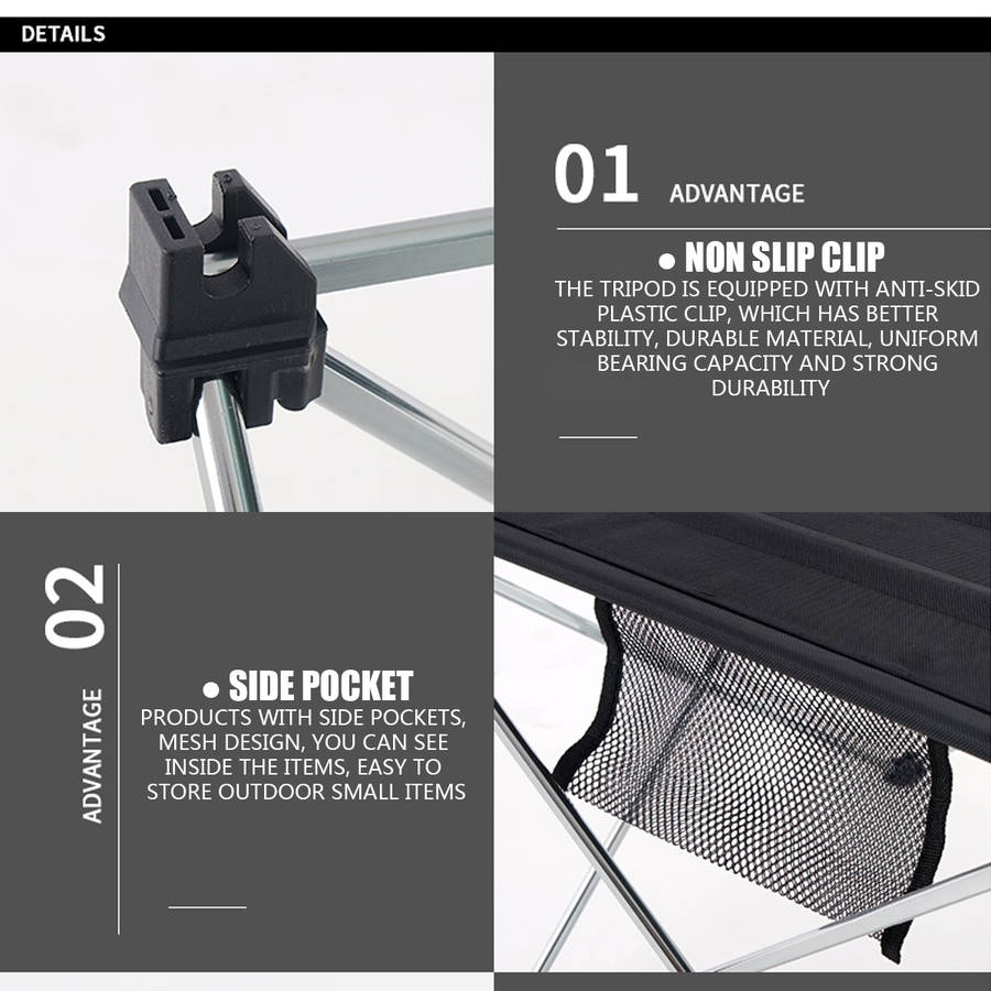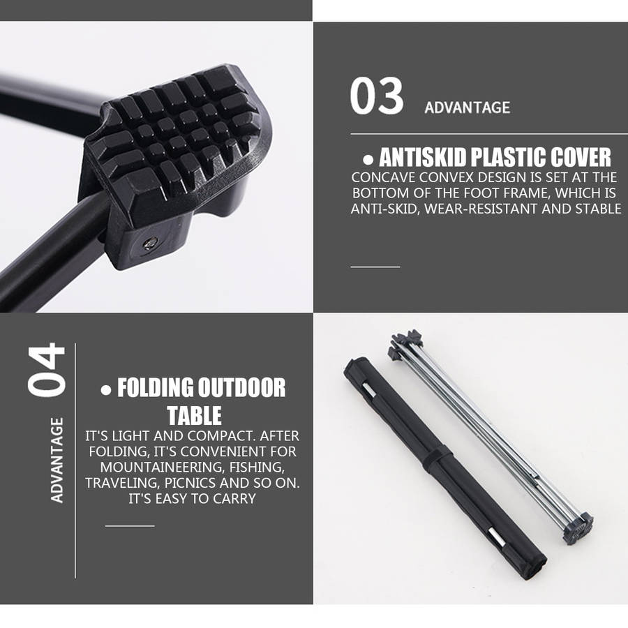 Features : a Simple assembly method, children and old people can easily install a Antiskid plastic cover Concave convex design is set at the bottom of the foot frame, which is anti-skid, wear-resistant and stable a Side pocket Products with side pockets, mesh design, you can see inside the items, easy to store outdoor small items a Non slip clip The tripod is equipped with anti-skid plastic clip, which has better stability, durable material, uniform bearing capacity and strong durability a Folding outdoor table It`s light and compact. After folding, it`s convenient for mountaineering, fishing, traveling, picnics and so on. It`s easy to carry a Encrypted Oxford cloth Adopt 1680D Oxford cloth, the fabric is strong and durable, can be used for a long time