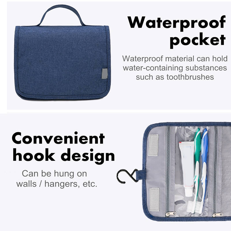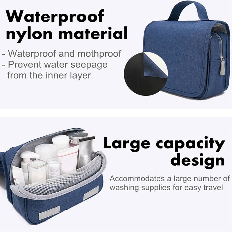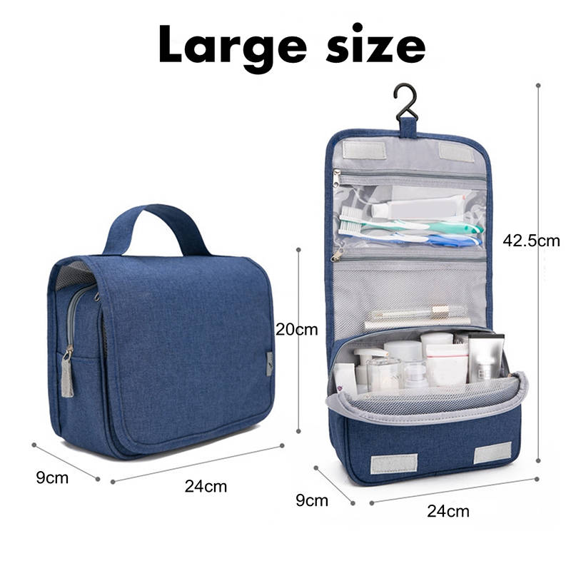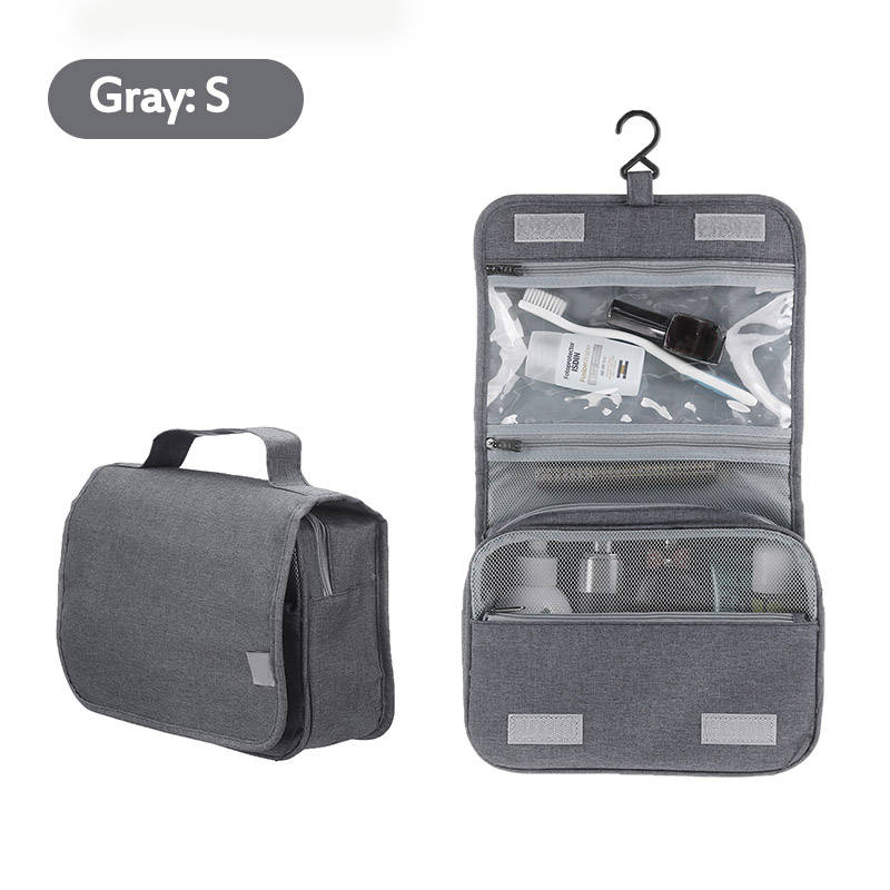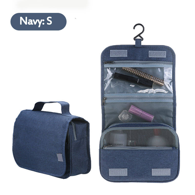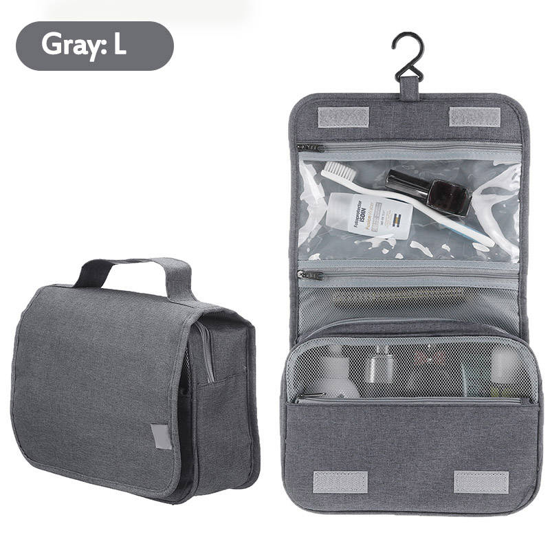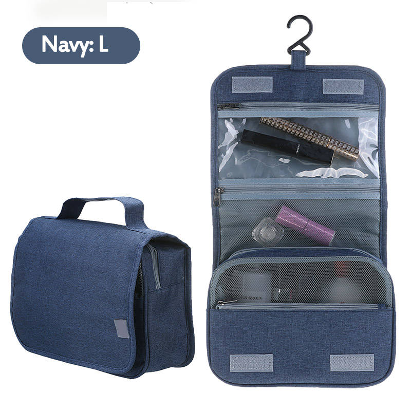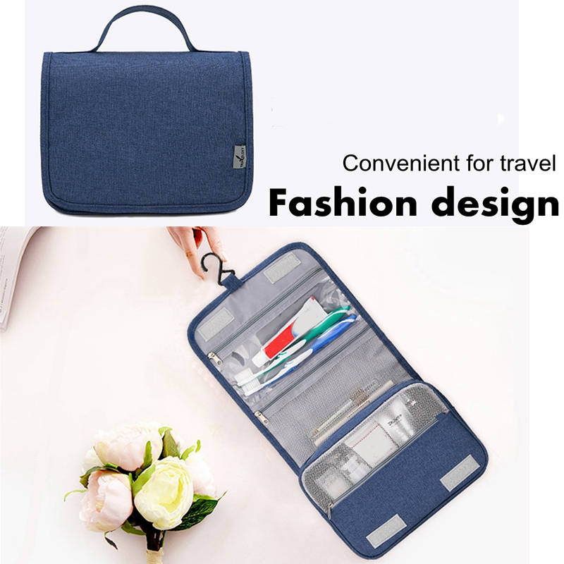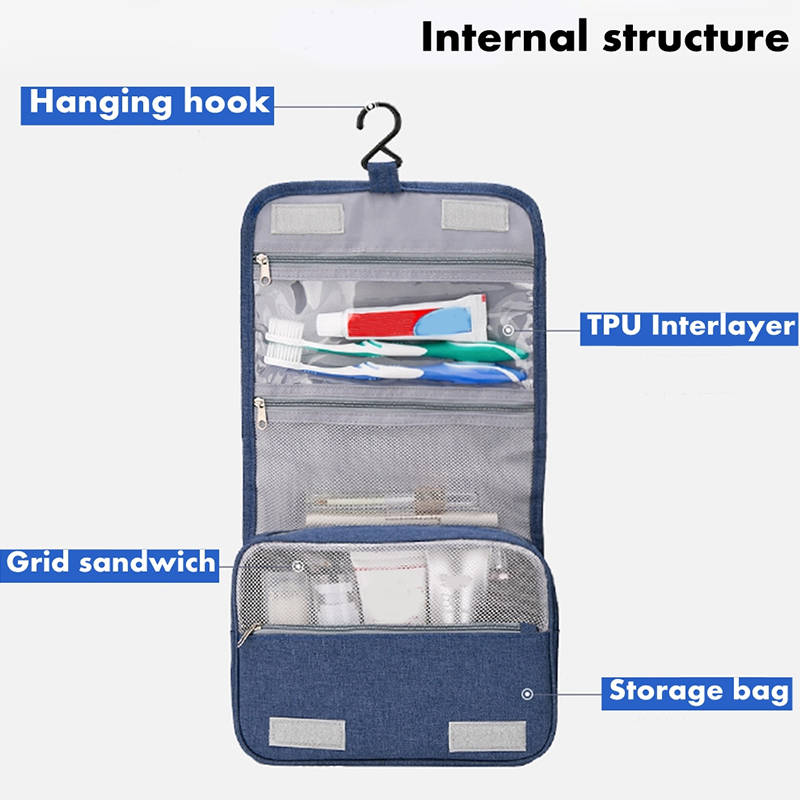 There is a hook inside, you can hang it where you want when you open the wash bag. (Please don't overweight). Compact 3 layers container with hook, can be Vertically unfolded. 1 large mesh compartment+1 large zipper compartment+ some small mesh pouches.