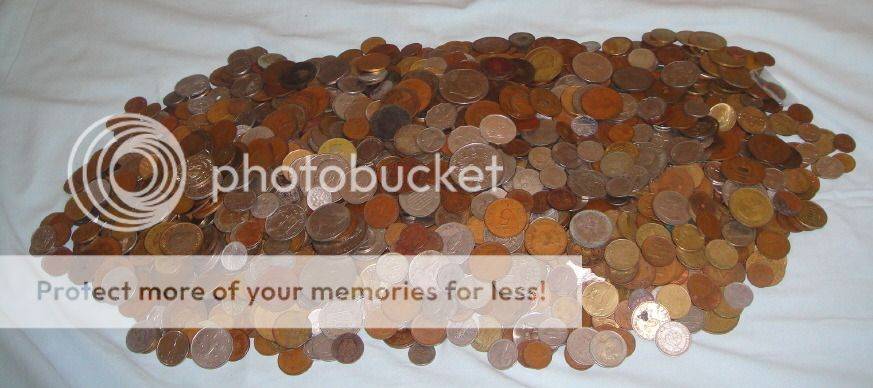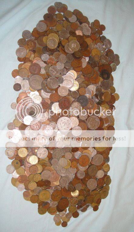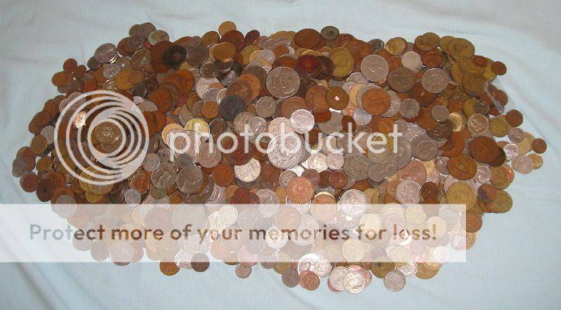 This is a mountain of coins from practically all the continents of the world spanning mostly the period from Victorian times to the second half of the previous century.