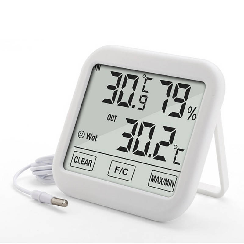 Appearance size: 105*94*25mm Weight: 120g Error: ±1a Accuracy: 0.1a Temperature measurement range: 0a ~ 50a (32a ~ 122a) Humidity measurement range: 10%~98% Power supply: 1.5V AAA battery2(not included) Temperature, humidity, clock, MAX, MIN memory, touch screen