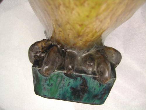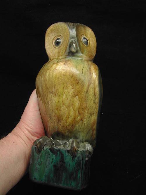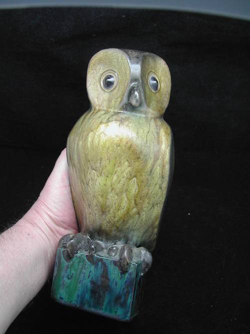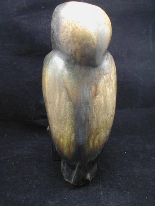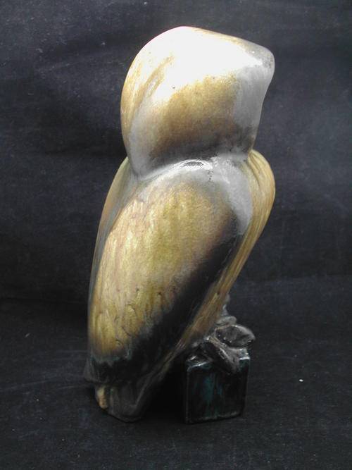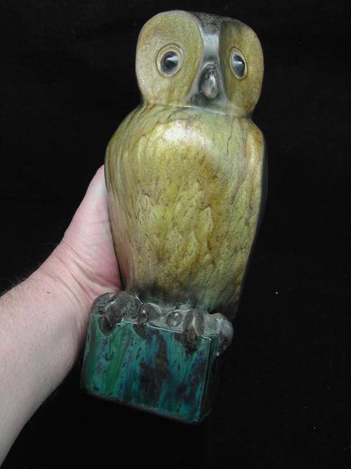 This stunning owl is signed underneath by the ceramicist who made him. G. Cassin, I was informed, stands for Georges Cassin, who allegedly was related to Louis Dage and whom he worked for in the 1920’s. I have not tried to research or verify any of this. Louis Dage’s had his studio in Paris, and is renown for his deco designs and Art Pottery (“Ceramique Francaises”) but also worked in other mediums. This wise old owl stands 27.5cm tall, and is free of cracks, chips and restoration. Please add R48 for postage.
