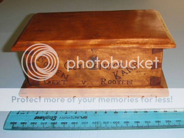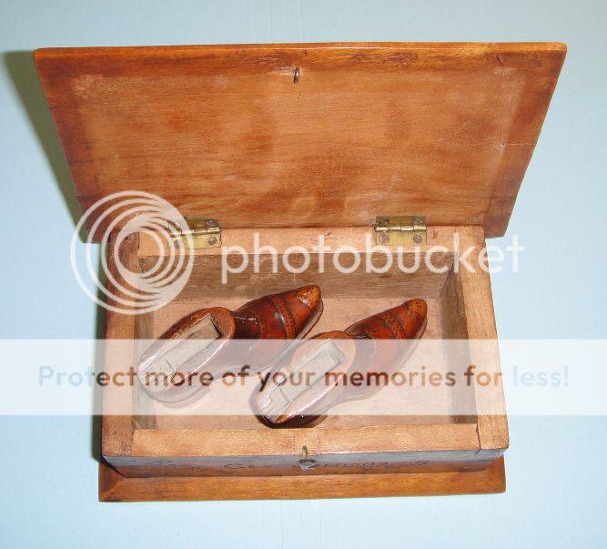 The two miniature wooden shoes that were found with the box are apparently called “trick shoes” – see plate 139 on page 86 of Pieter Oosthuizen’s Boer War Memorabilia – The Collectors’ Guide.