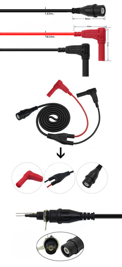 Type: RG58 Coaxial Cable Convert From: BNC Male Convert To: Right angle Banana Plug Impedance: 50 ohm 500V/5A Length: 120cm Main lead dismeter:5mm Sub-line:3.5mm
