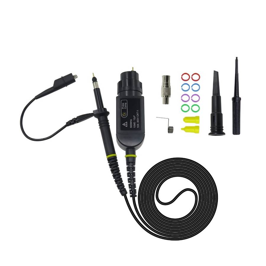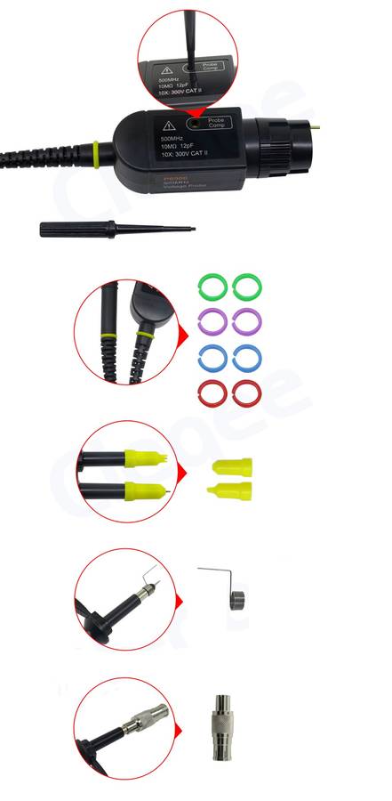 Descriptions: This probe is 500MHz Oscilloscope probes with a switch for 10x attenuation, stable performance. And providing several accessories designed to make probing and measurements a simple task. Features: This probe is 500MHz Oscilloscope probes with a switch for 10x attenuation. This probe is good oscilloscope accessories, suitable for BNC interface oscilloscope. This high quality probe is used in professional test equipment, probe has a 1.22m cable with standard BNC end. This probe has stable performance, providing several accessories designed to make probing and measurements a simple task. Adjusting tool: adjusts compensation capacitance to assure the rapier match with oscillograph. Marker rings in different colors help to identify different channels. Specifications: Model: P6500 Attenuation ratio: 10X Input resistance: 10 M&; Input capacitance:10X:10pF~13pF Compensation range: 9pF~25pF System bandwidth:10X: DC-500Mhz Input voltage: 10X: < 600VDC+ AC Vp-p Operating temperature range: 15 ᆪ ~ + 75 ᆪ Not working temperature range: - 20 ᆪ ~ + 60 ᆪ Process: injection molding integration Color:black Cable length: 122cm /48inch Humidity: a 85% (relative humidity) Weight: 82g Package Included: 1 x Oscilloscope Probes 1 x adjust tool 2 x tip locating sleeve 4 pair x color circle 1 x spring circle 1 x joint