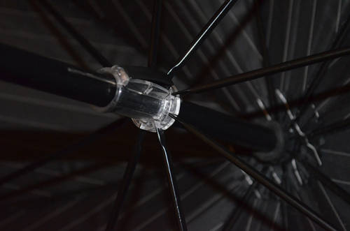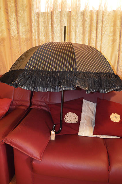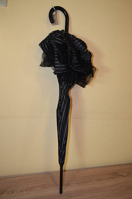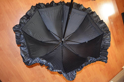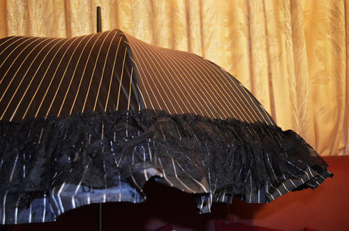 A very stylish pinstripe umbrella with domed pagoda and edged with a deep delicate black lace trim.