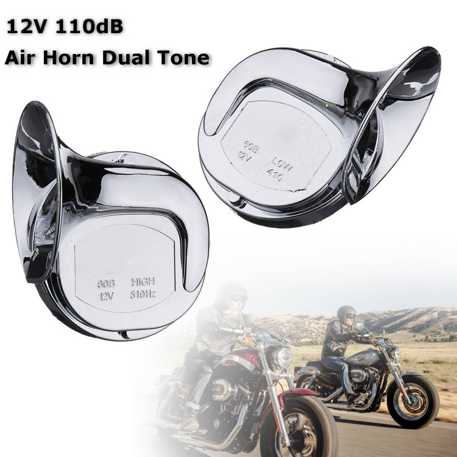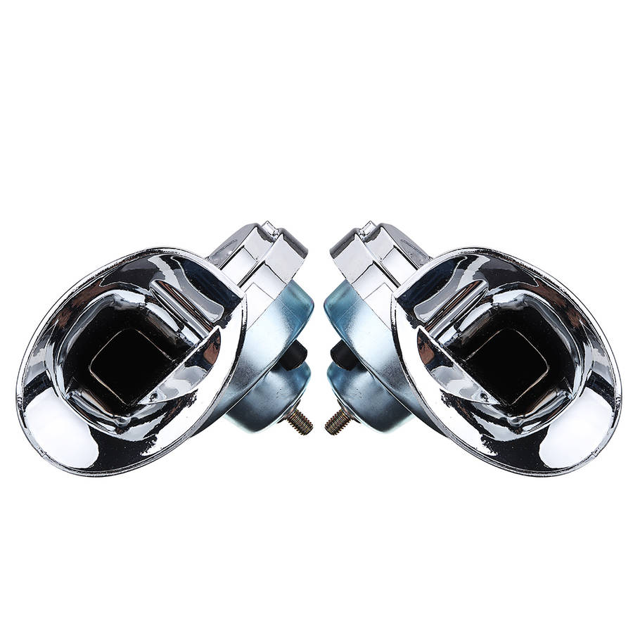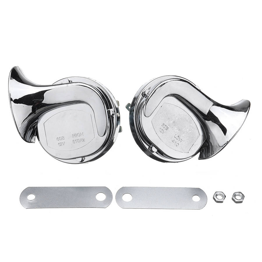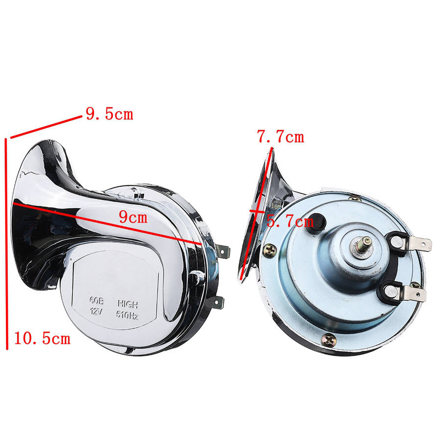 Description: 1. Corrosion of tungsten contacts,high temperature,no oxidation,good contact 2. Unique breathing design with snail performance,heat and strong 3. With universal mounting brackets, installation is simple 4. Universal fit for most motorcycles or cars. Specification: Color: Chrome Material: Plastic and Metal Frequency: 410-510 Hz Voltage: 12V DC dB:110 dB Size:10.5*9.5*9 cm Package Included: 1 X Pair Horns
