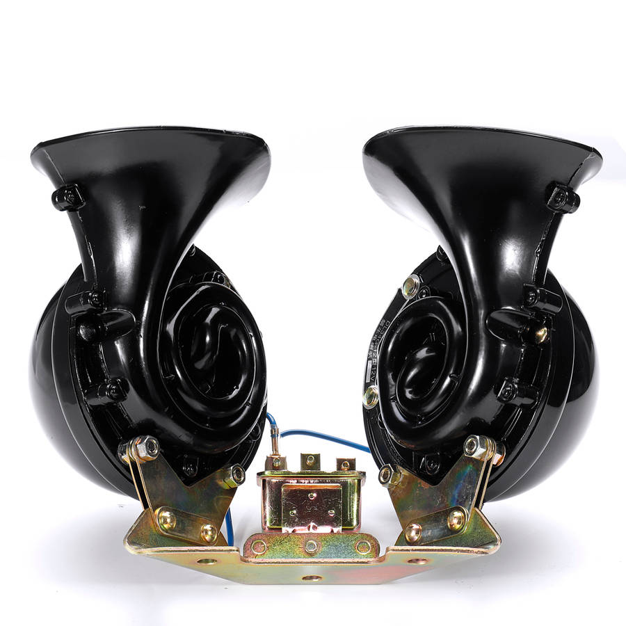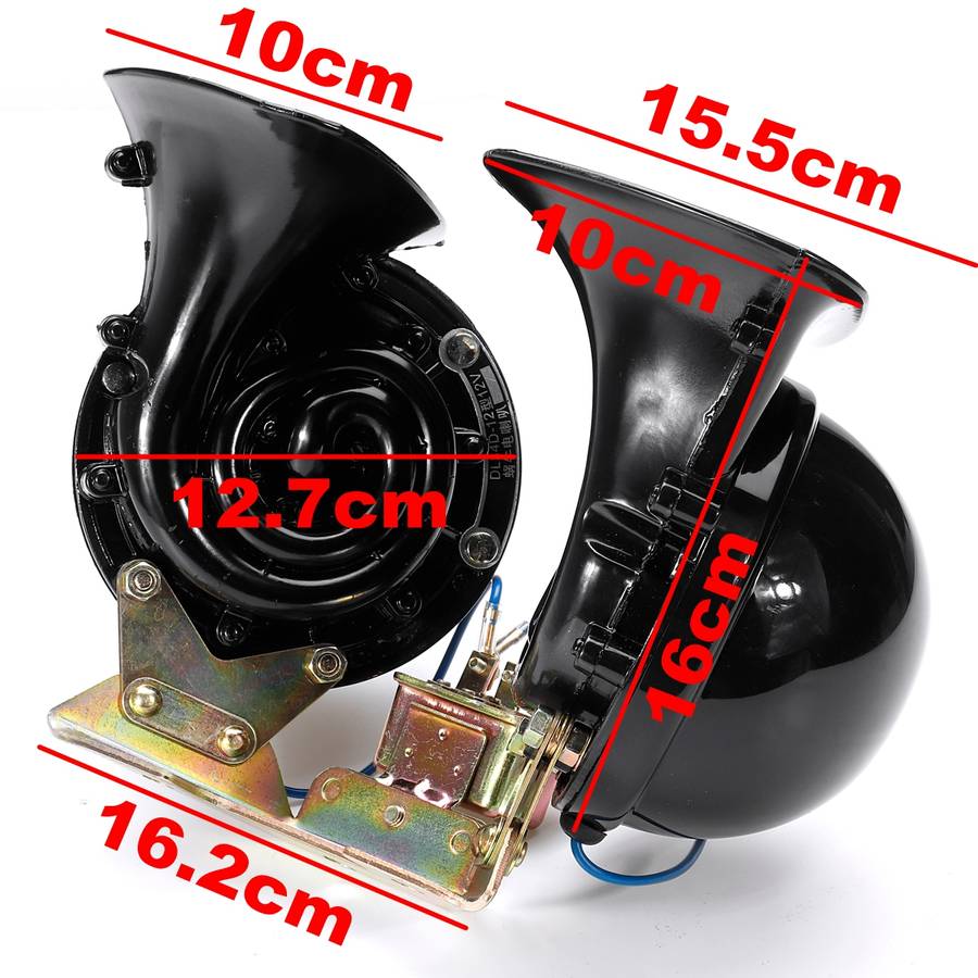 Specification: Color: Black Material: ABS and Metal Voltage: 12 V Amps: 8 A Volume level:300-350 dB Features: Corrosion of tungsten contacts,high temperature,no oxidation,good contact Unique breathing design with snail performance,heat and strong With universal mounting brackets, installation is simple Universal fit for most motorcycles or cars. Package included: 2 X Horn
