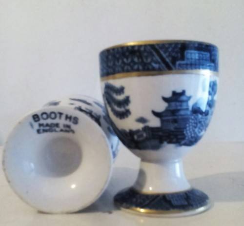 Pair Booth's ceramic Willow pattern egg cups. Dark blue pattern with gilded edged and gilt patterned edge to cup inner. Stands 60mm high. Stamped Booths, Made in England to base. In good condition.