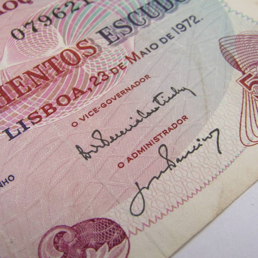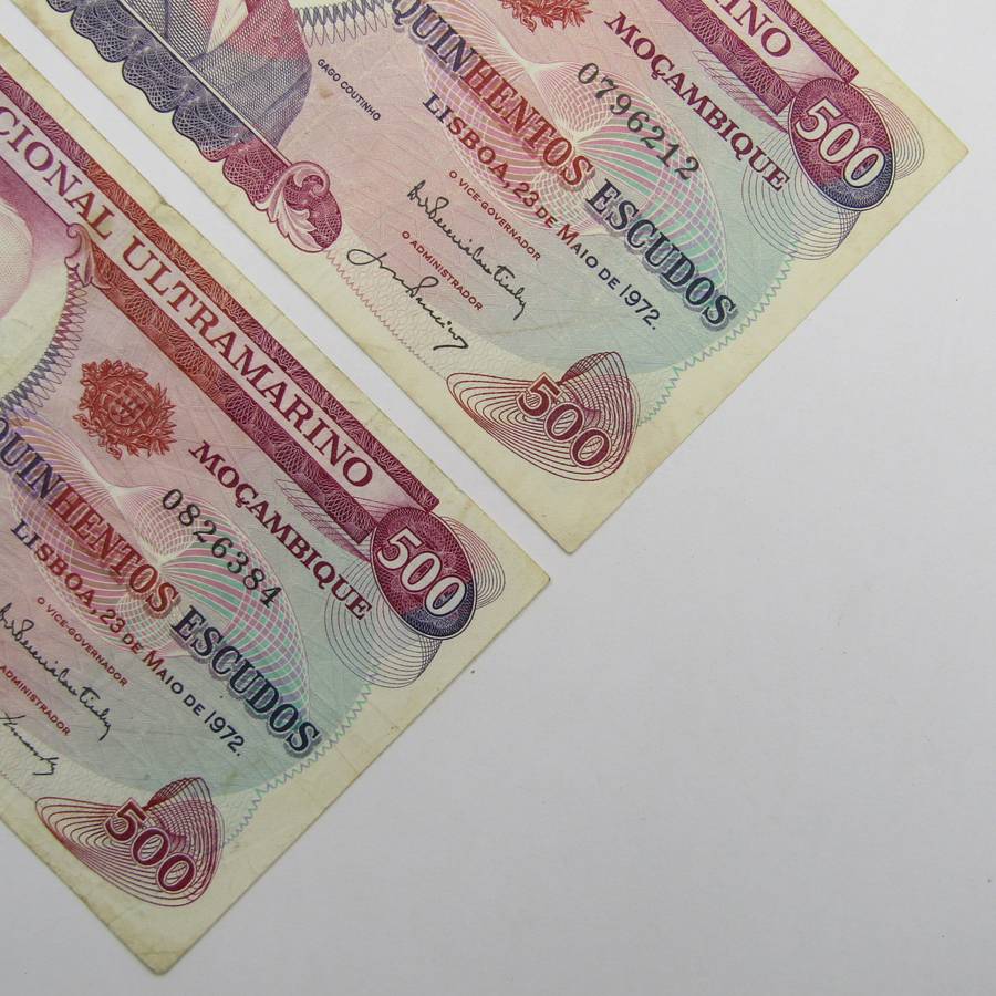 Pair of 1972 500 Mozambique Escudos banknotes - 2 notes with different signatures
