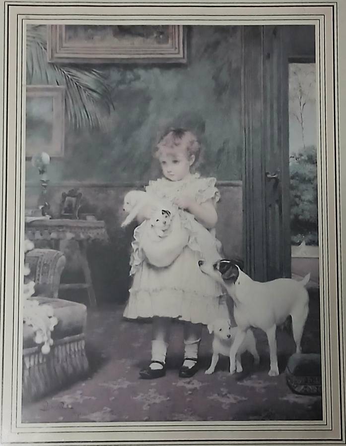 Step back into the sentimental world of Victorian Britain with this charming pair of antique prints, beautifully framed behind glass. Each piece offers a heartwarming glimpse into domestic life, rendered by artists celebrated for their ability to portray the unique bond between children and their canine companions, all within the timeless appeal of the Victorian era.