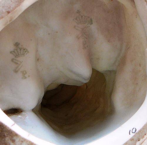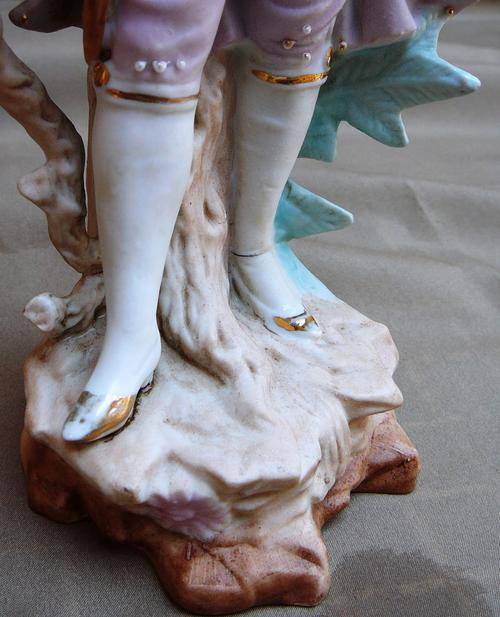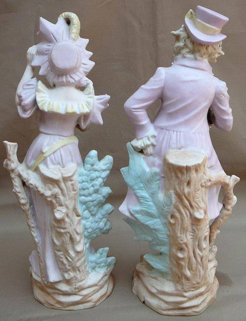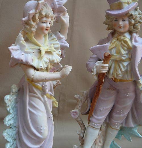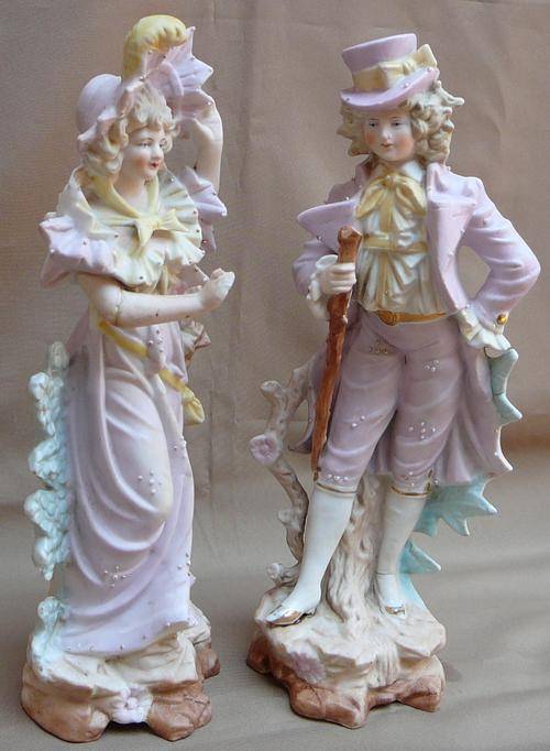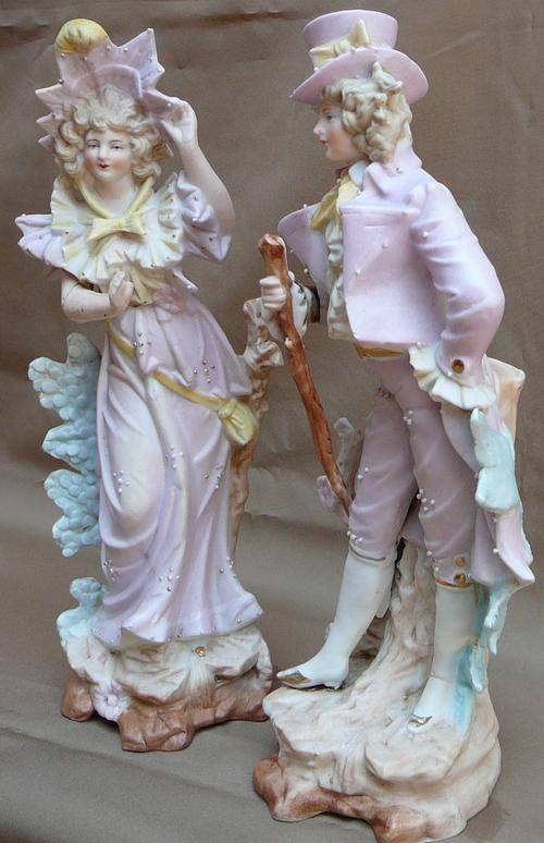 This delightful pair wearing Sunday Best out for a walk in the country. The Gentleman is in very good condition but there are signs of makers flaws which can be seen in the pictures. The Lady sadly has a broken arm which has been repaired and also some finger tips are missing. They stand 285 mm high and total weight is 875 grams.