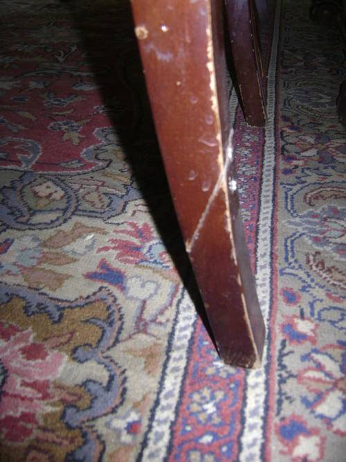 CHAIRS ARE STILL IN GOOD CONDITION - ( PLEASE NOTE THAT THE ONE LEG WAS REPAIRED AT SOME STAGE AND THE VARNISH IS PEELING OFF IN SOME AREAS.)