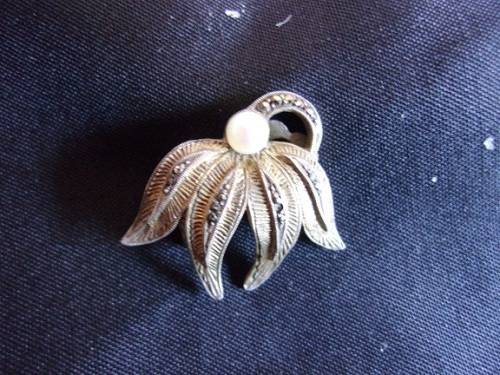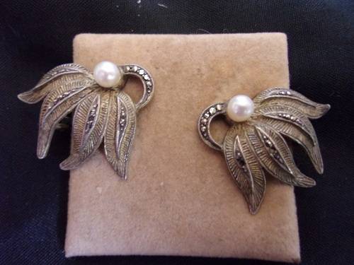 Pair of beautiful Sterling silver and freshwater pearl clip on earrings. I would date this pair of earrings to the early 1900s. They are leaf shaped with a pearl on each earring. The earrings are marked Sterling on the inside, and have been tested as .925 silver. They weigh 7.5g, and are in good condition - one clip is a bit loose but not broken. Great buy for your jewellery box.